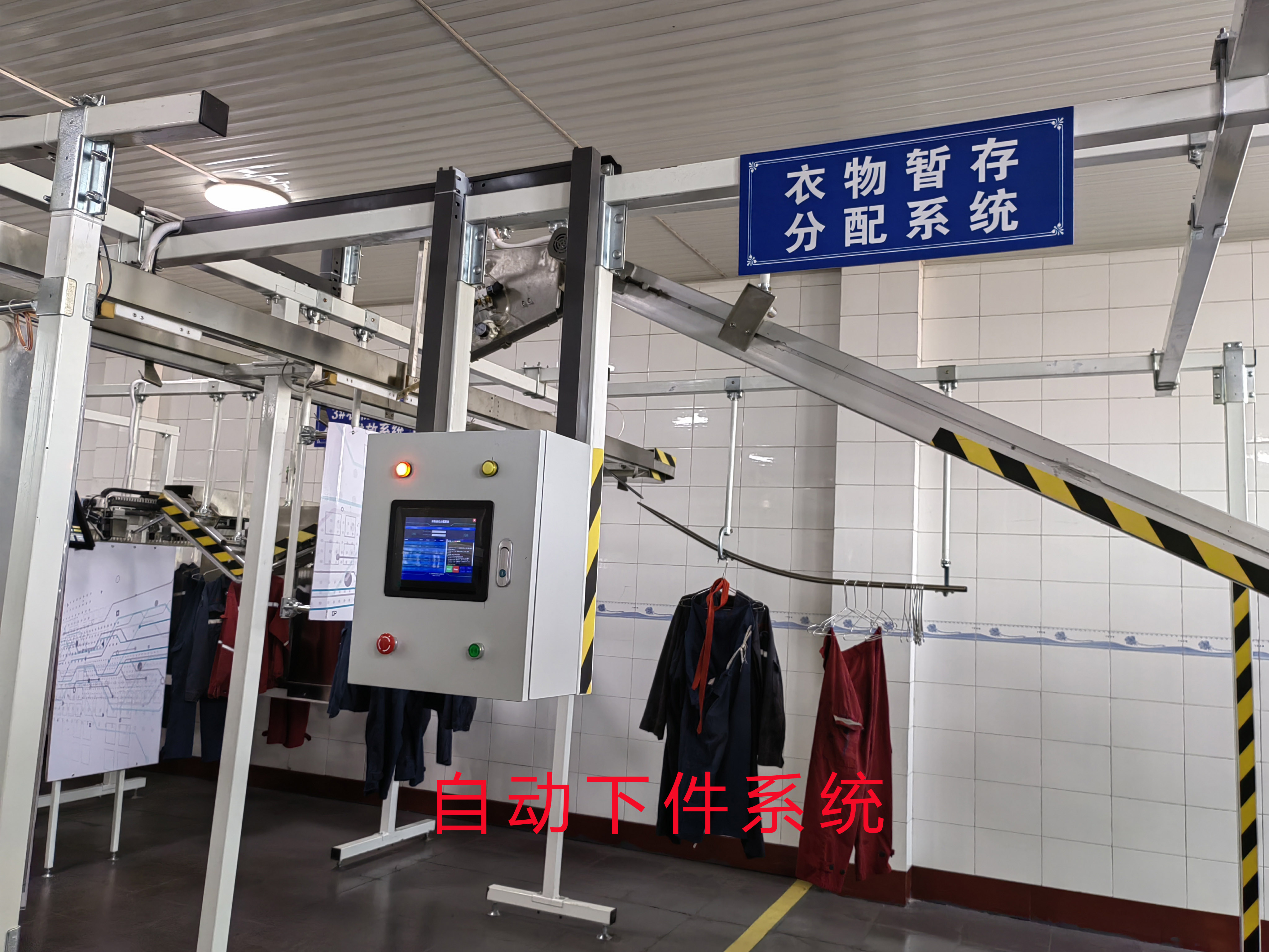 系統(tǒng)由臟衣投放口、傾斜式洗衣機、節(jié)能型衣服連續(xù)烘干機、一次分揀線、儲衣發(fā)放線、取衣口六部分組成。在衣物里植入芯片,工人取衣時,刷臉即可取衣。全過程自動化、智能化運行,數(shù)字化管理。只需1-2人操作,每班洗衣量700件-2500件。與現(xiàn)有同類設備比較,可節(jié)約電能50%,節(jié)省人工50%。